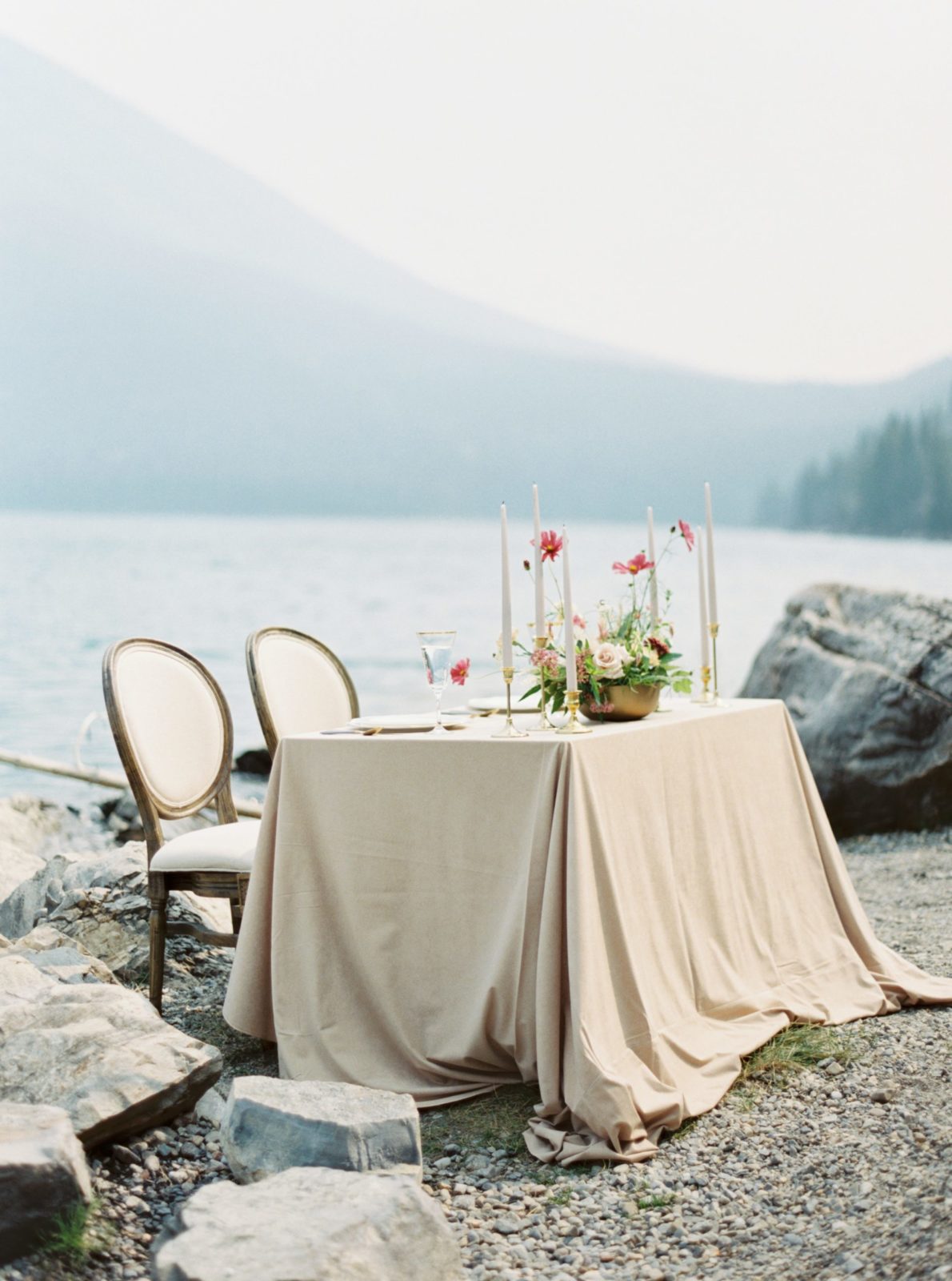 “A popular wedding destination, the Rocky Mountain range in Alberta, Canada is known for its rugged and often masculine beauty. For contrast I wanted to pair the masculine setting with a feminine and elegant strength, while still feeling soft and regal; to achieve this we wove delicate pieces throughout each styled element. We chose locations to really highlight the diversely beautiful landscape of the Rocky Mountains and elevated the naturally wild surroundings with locally sourced vendors and talent.”
