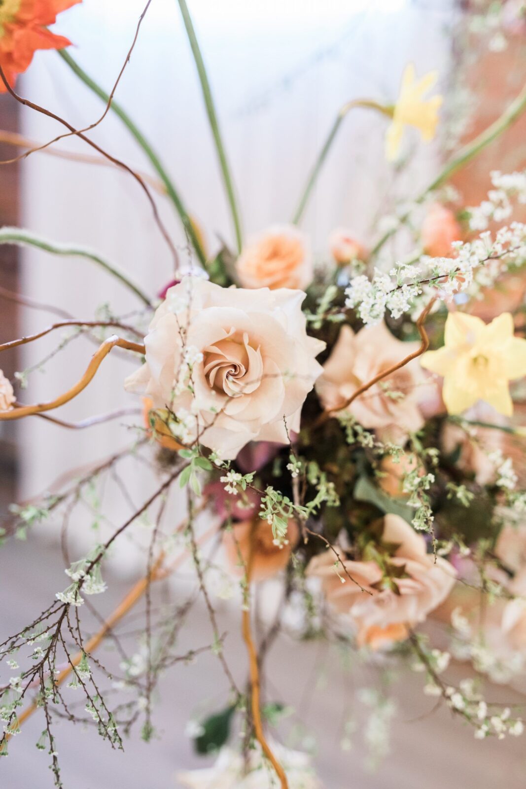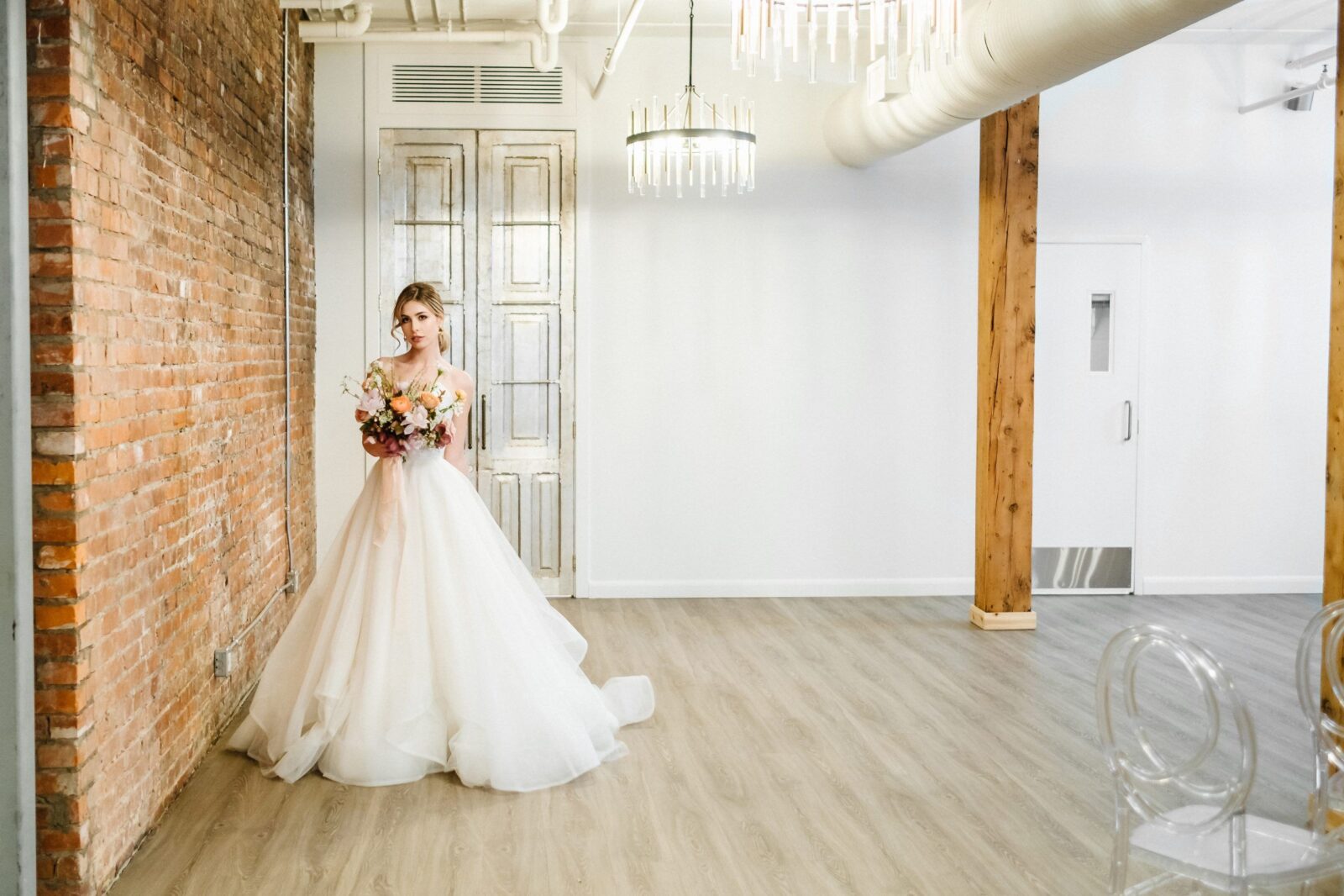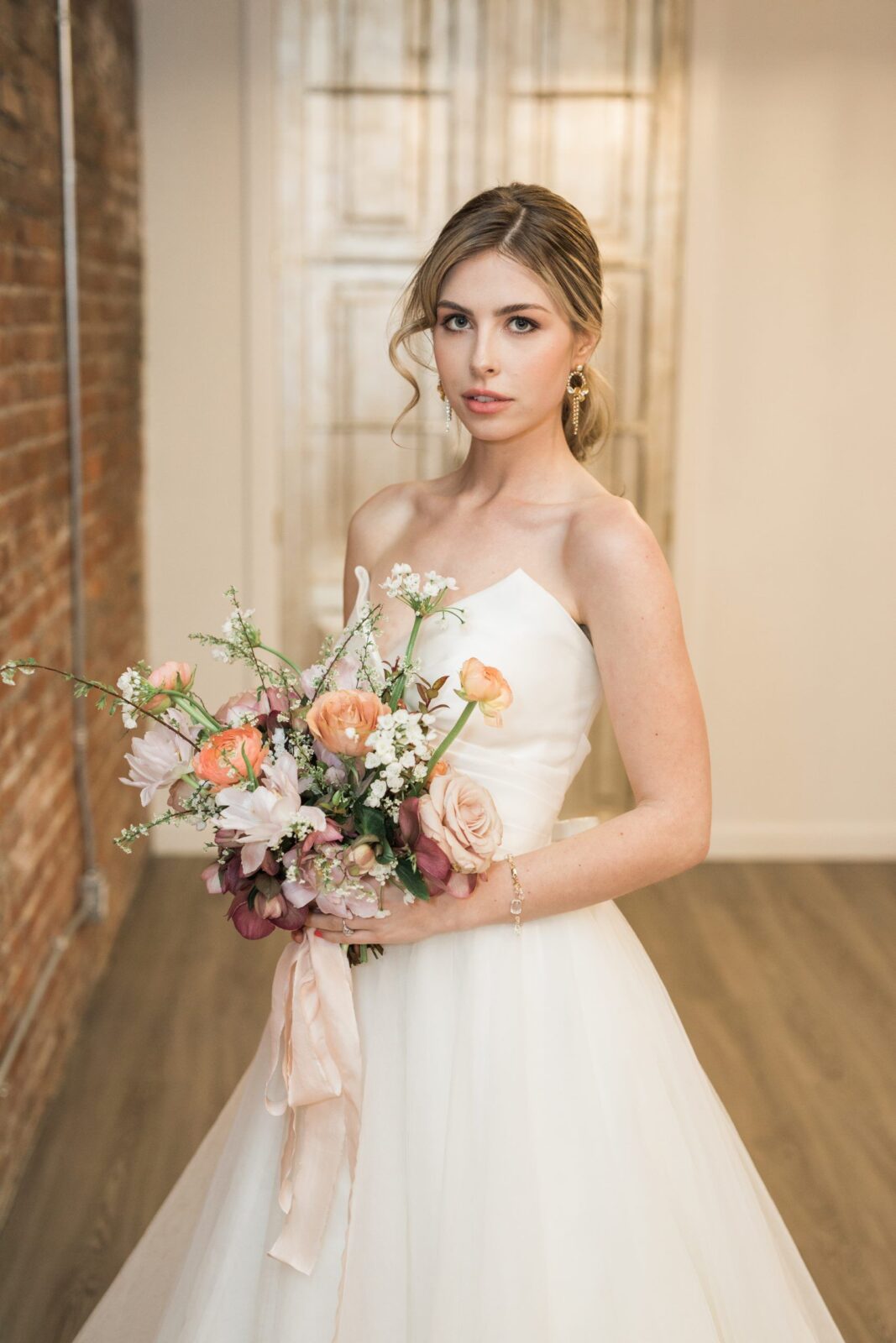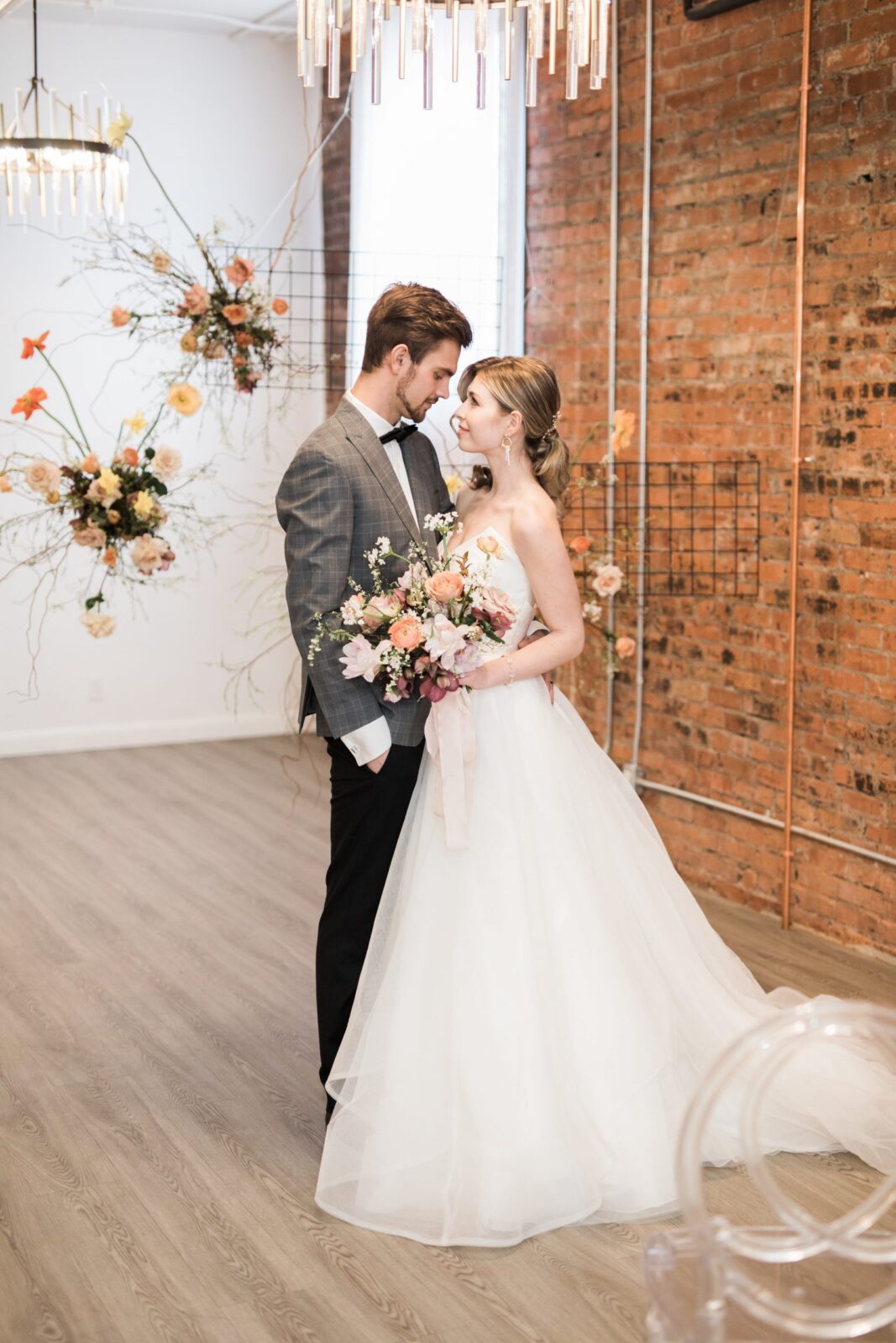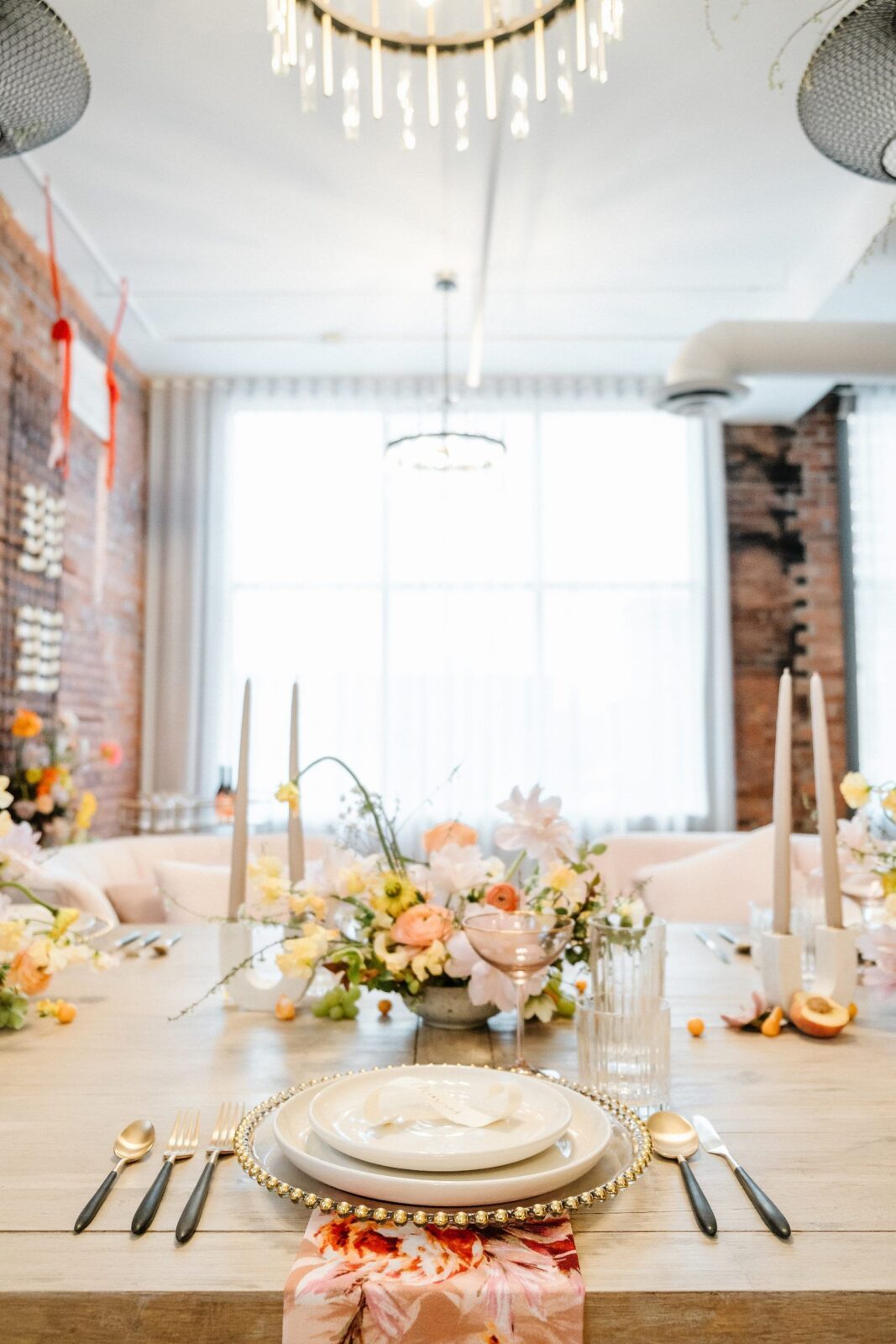 As we were designing this wedding inspiration, we chose to contrast the feminine peach palette with a couple avant-garde hanging installations in the modern industrial space of Venue308. Rather than playing it safe with soft blushes and subtle peach tones, we wanted to infuse our palette with bold yellows, oranges, and pinks, to bring peach to the modern-day bride with boldness and beauty.