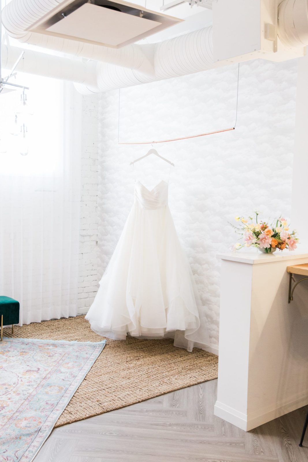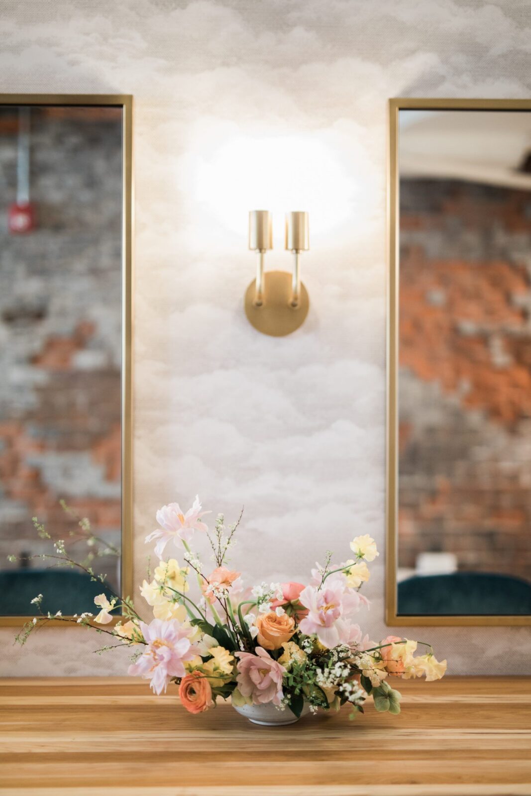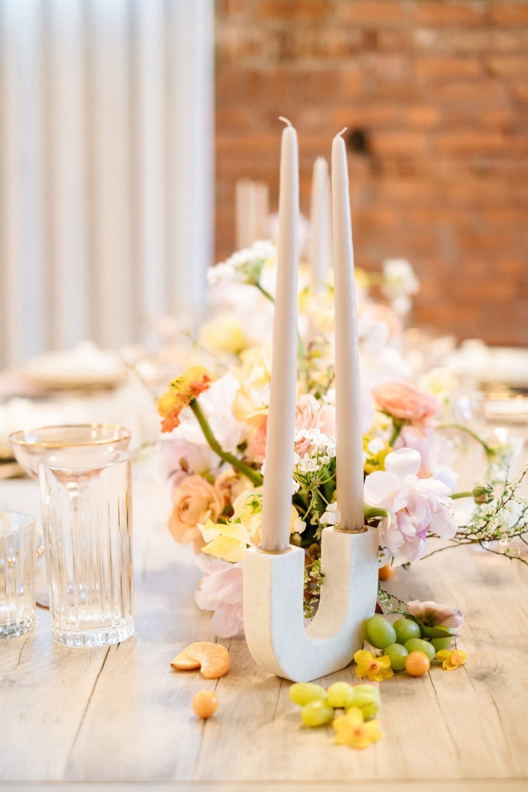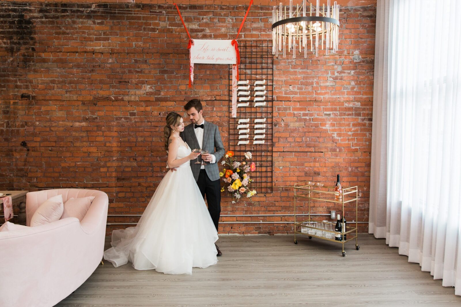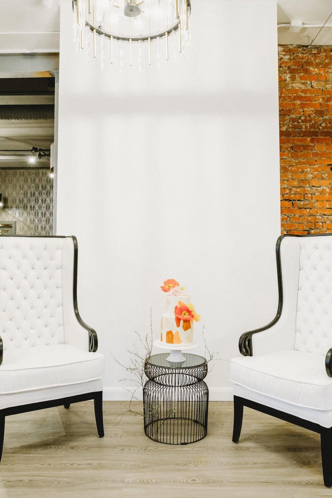 As we were designing this wedding inspiration, we chose to contrast the feminine peach palette with a couple avant-garde hanging installations in the modern industrial space of Venue308. Rather than playing it safe with soft blushes and subtle peach tones, we wanted to infuse our palette with bold yellows, oranges, and pinks, to bring peach to the modern-day bride with boldness and beauty.